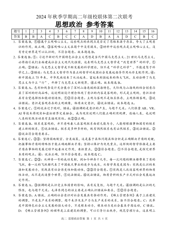 广西河池市2024-2025学年高二上学期12月联盟考试政治答案