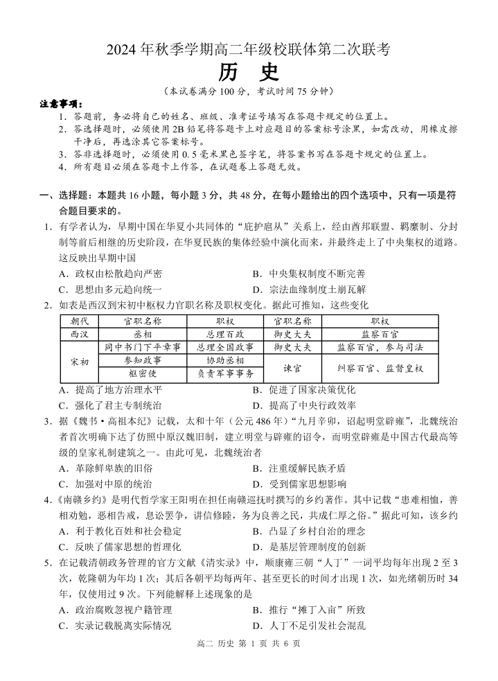 广西河池市2024-2025学年高二上学期12月联盟考试历史
