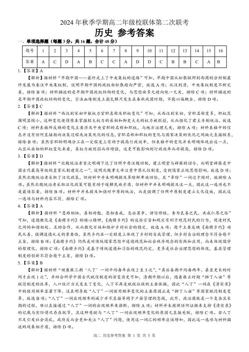 广西河池市2024-2025学年高二上学期12月联盟考试历史答案