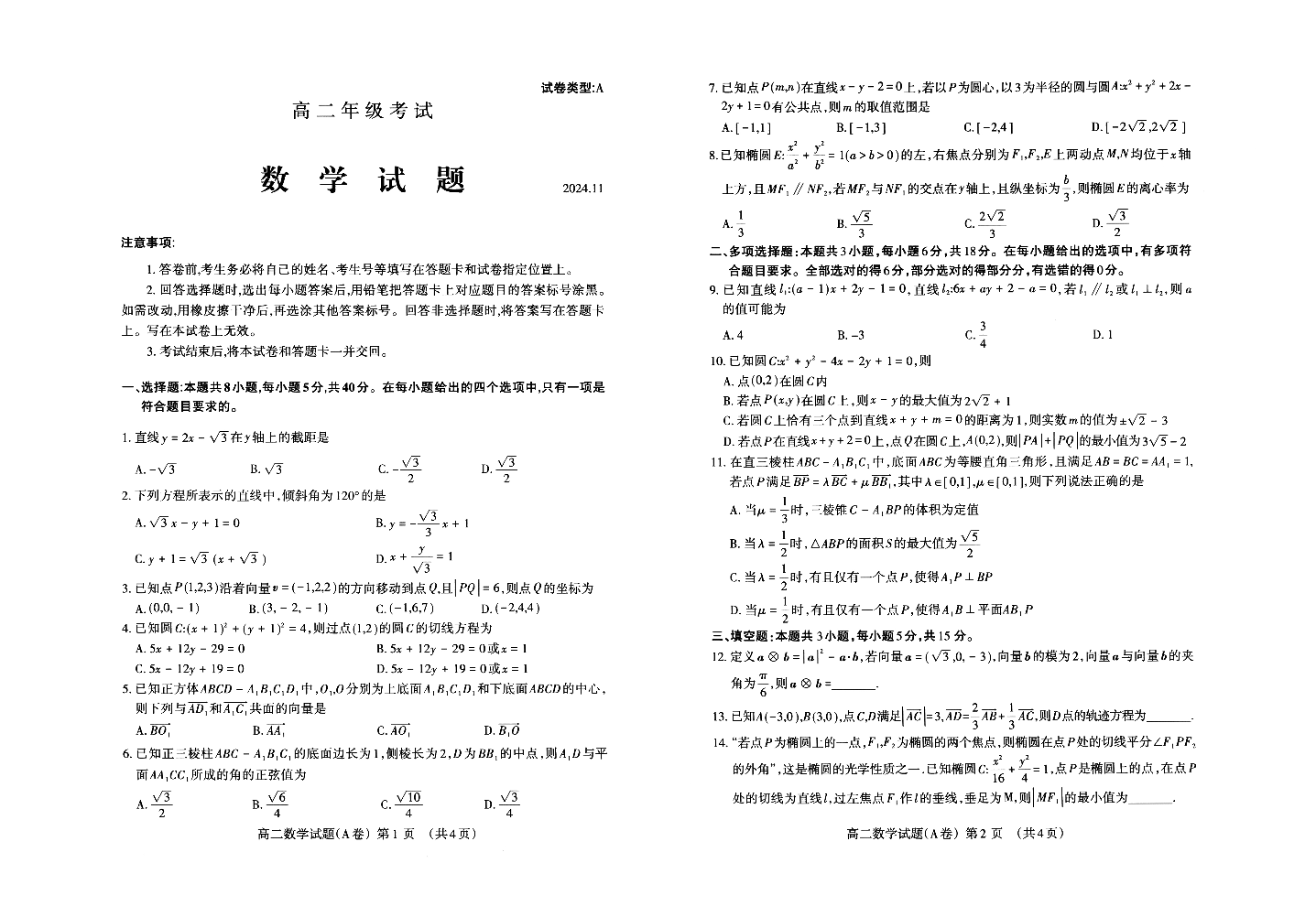 山东省泰安市2024.11高二年级期中统一考试-数学