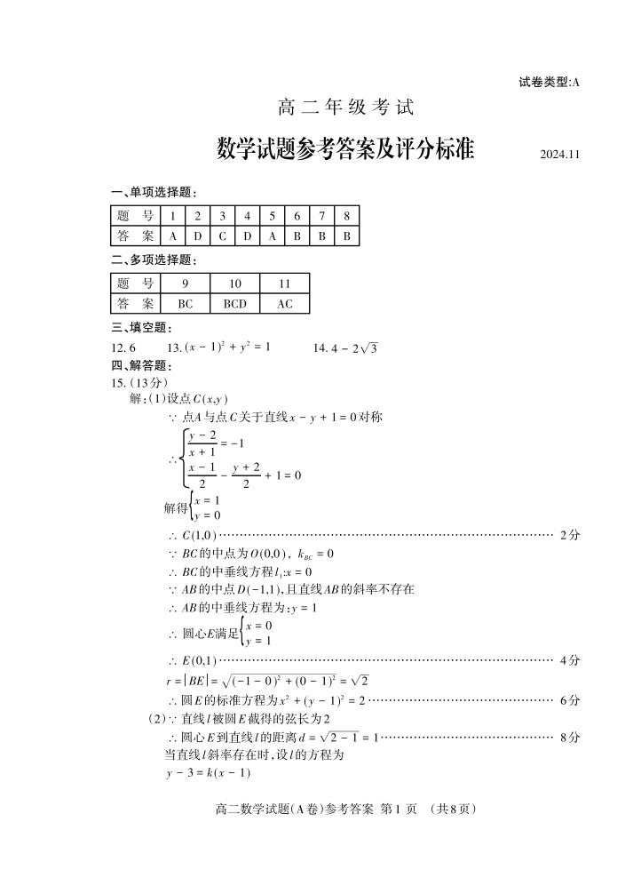 山东省泰安市2024.11高二年级期中统一考试数学答案