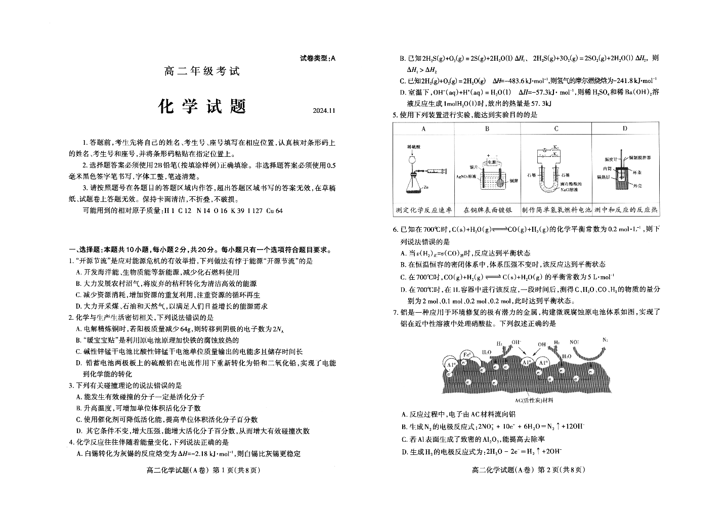 山东省泰安市2024.11高二年级期中统一考试-化学