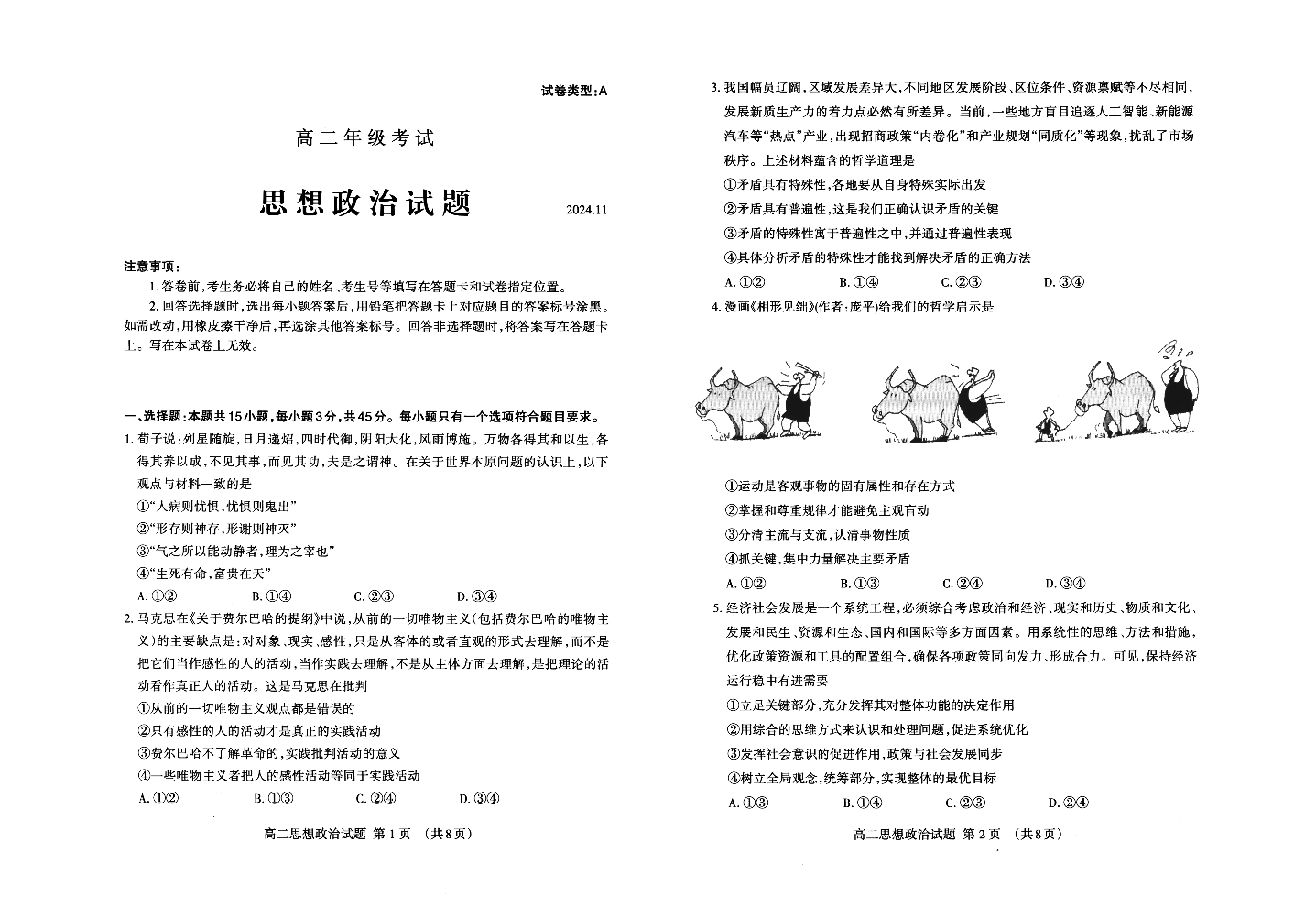山东省泰安市2024.11高二年级期中统一考试-政治