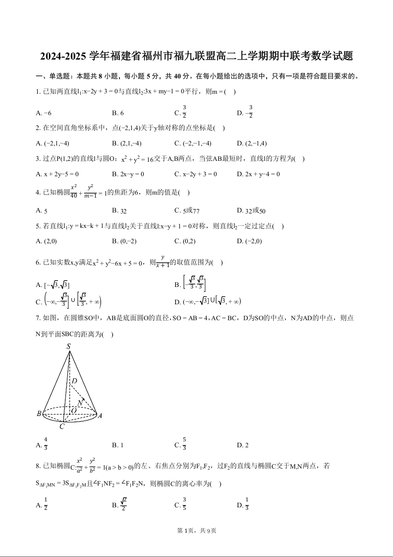 福建省福州市福九联盟2024-2025学年高二上学期11月期中联考数学Word版含答案