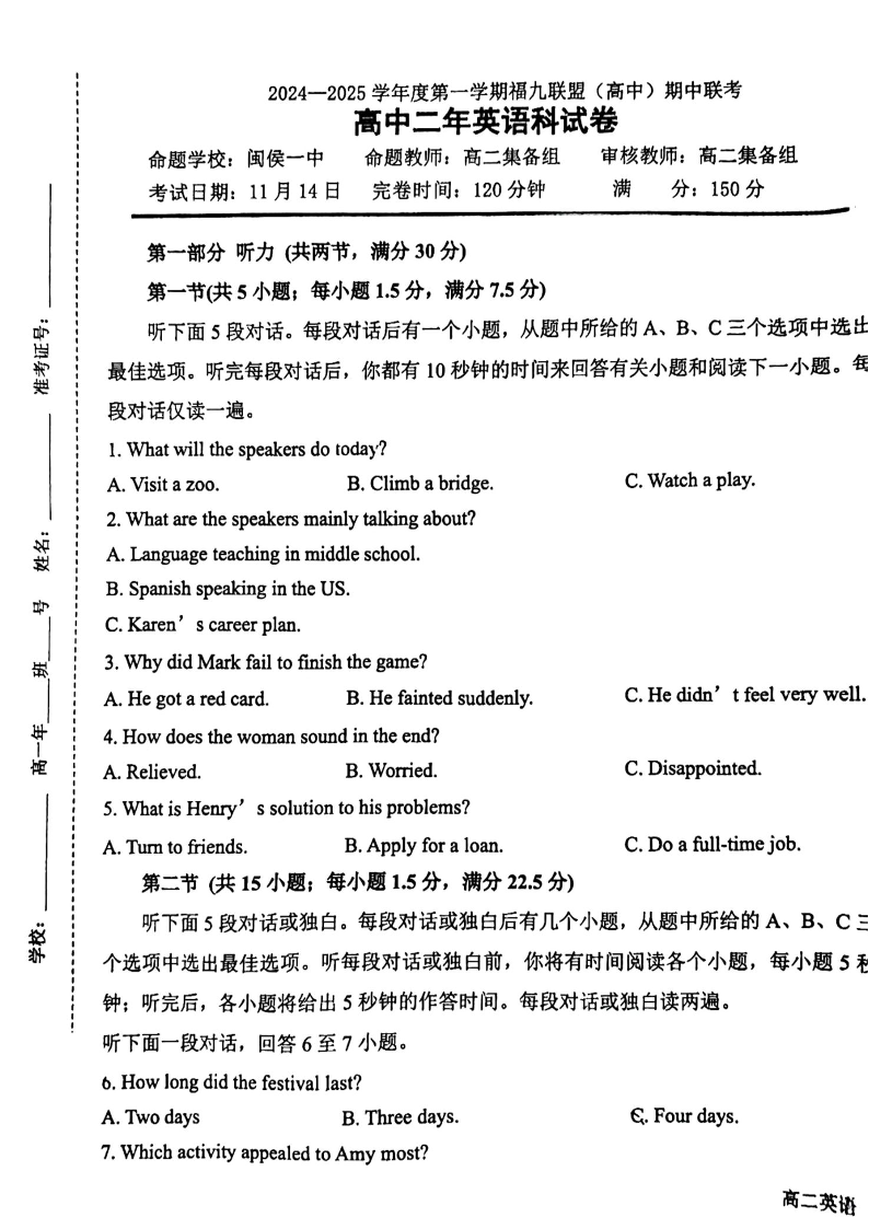 福建省福州市福九联盟2024-2025学年高二上学期11月期中联考英语