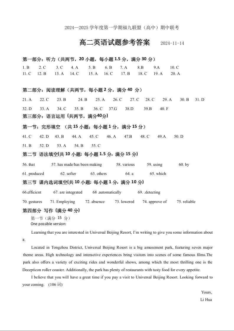 福建省福州市福九联盟2024-2025学年高二上学期11月期中联考英语答案