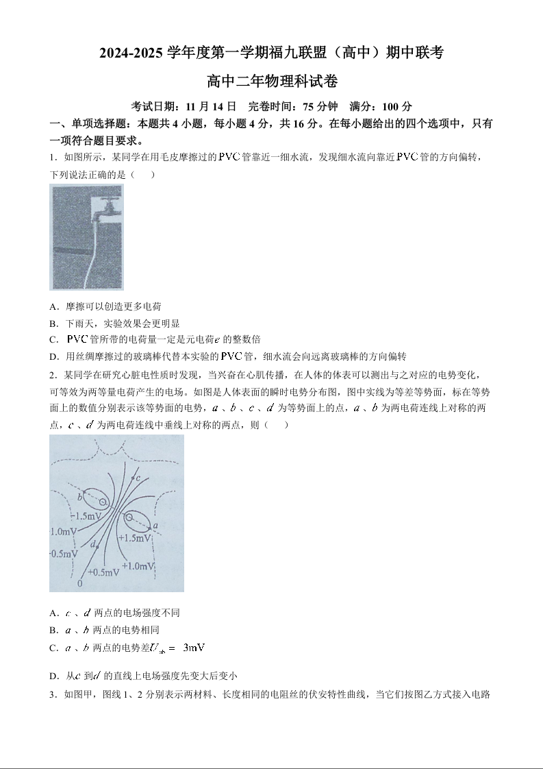 福建省福州市福九联盟2024-2025学年高二上学期11月期中联考物理Word版含答案