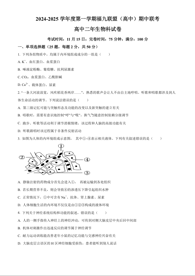福建省福州市福九联盟2024-2025学年高二上学期11月期中联考生物(原卷版)