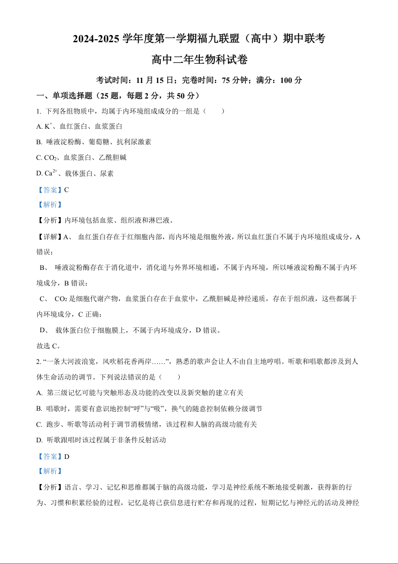 福建省福州市福九联盟2024-2025学年高二上学期11月期中联考生物(精品解析版)