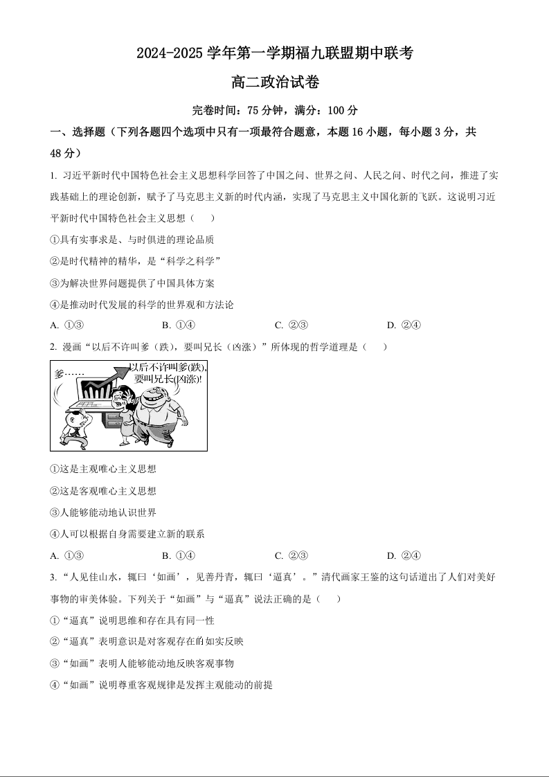 福建省福州市福九联盟2024-2025学年高二上学期11月期中联考政治(原卷版)