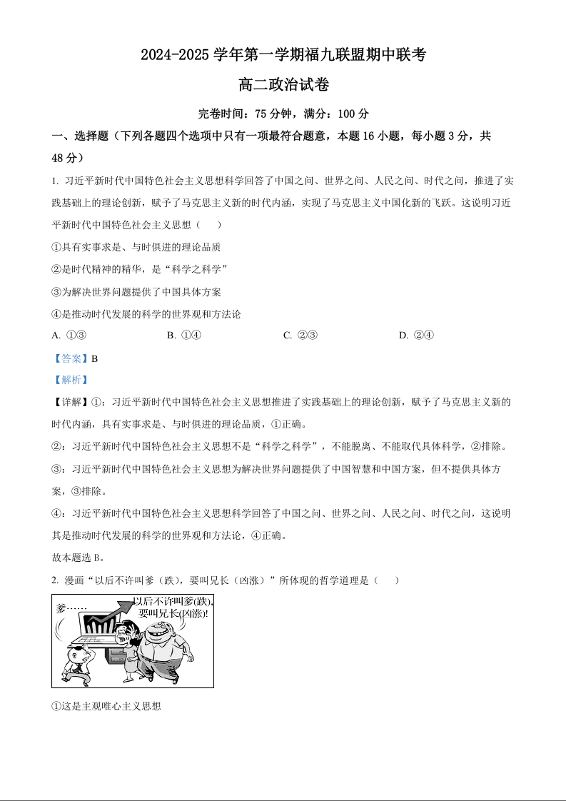 福建省福州市福九联盟2024-2025学年高二上学期11月期中联考政治(精品解析版)