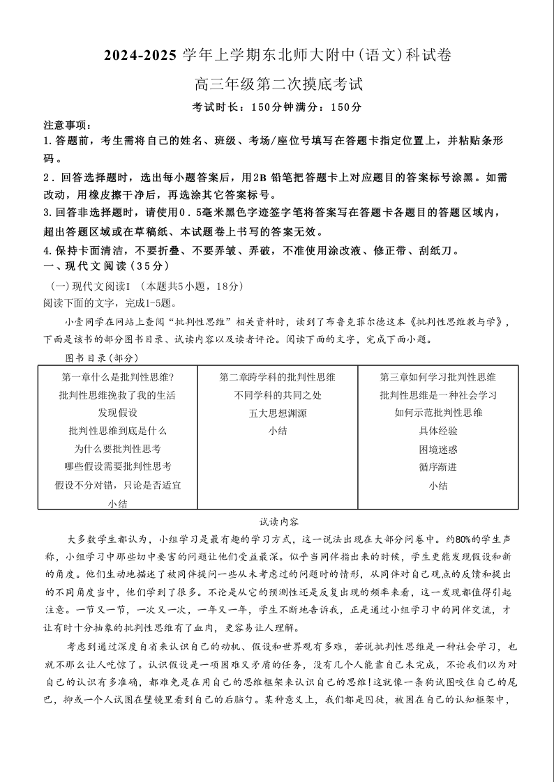 吉林省东北师大学附中2025届高三年级上学期第二次摸底考试语文+答案