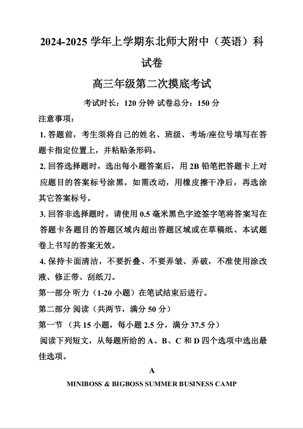 吉林省东北师大学附中2025届高三年级上学期第二次摸底考试英语(精品解析版)