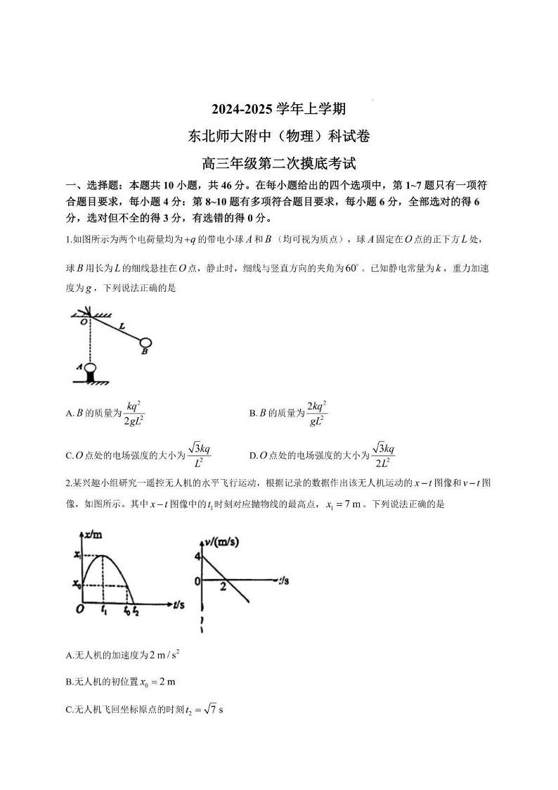 吉林省东北师大学附中2025届高三年级上学期第二次摸底考试物理+答案