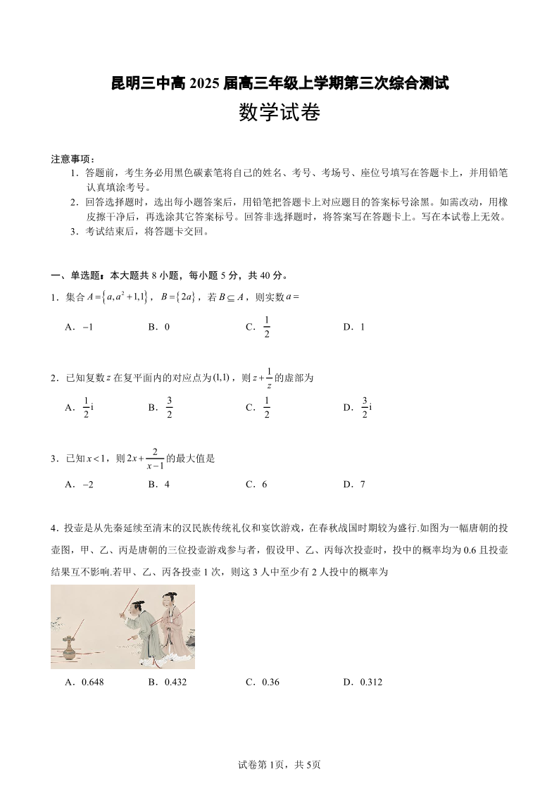 云南省昆明市第三中学2024-2025学年高三上学期11月月考数学