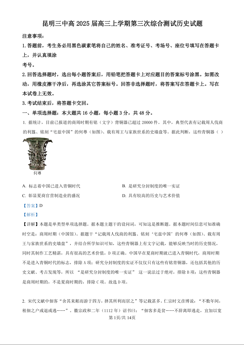 云南省昆明市第三中学2024-2025学年高三上学期11月月考历史答案
