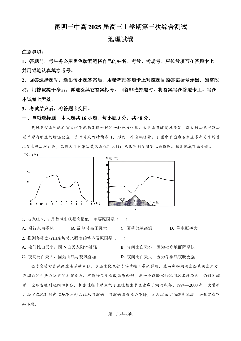 云南省昆明市第三中学2024-2025学年高三上学期11月月考地理