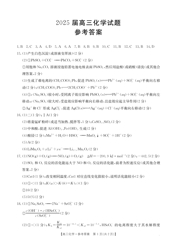 四川省部分学校2024-2025学年高三12月联考化学答案