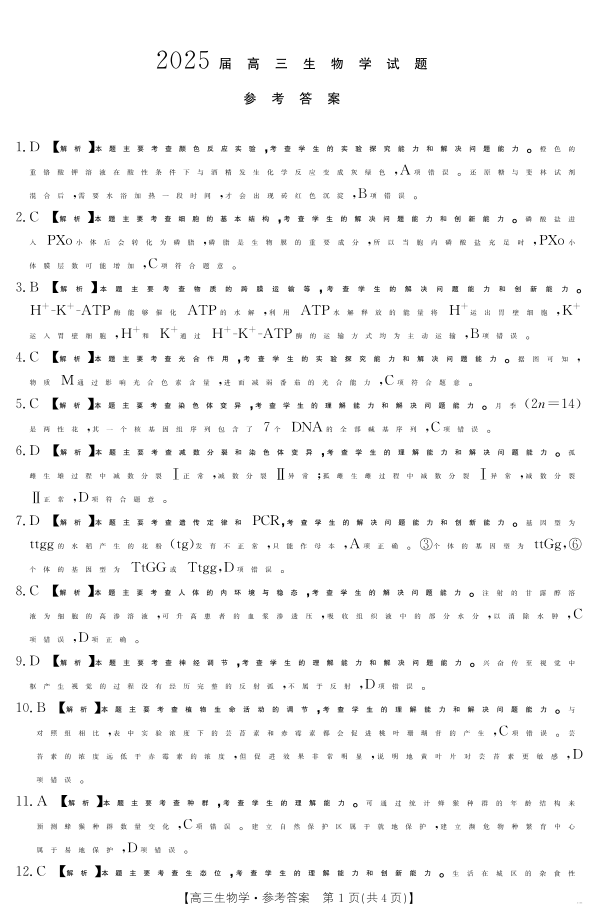 四川省部分学校2024-2025学年高三12月联考生物答案