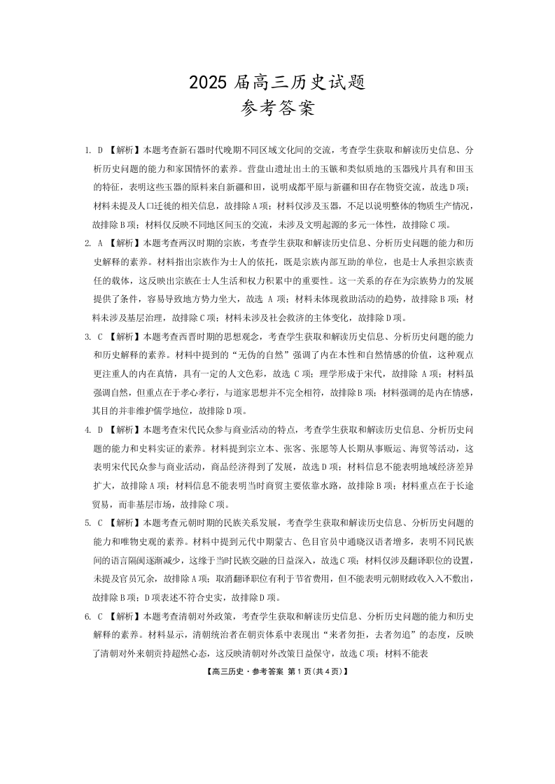 四川省部分学校2024-2025学年高三12月联考历史答案