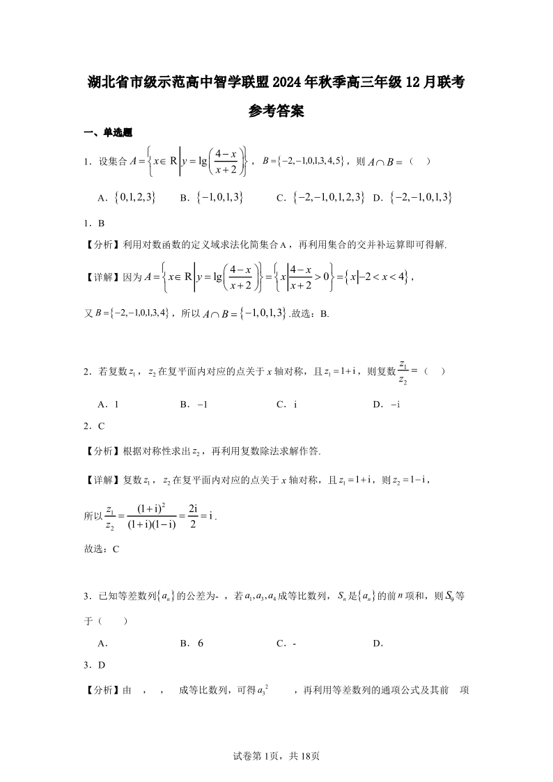 湖北省市级示范高中智学联盟 2025届高三12月联考数学答案