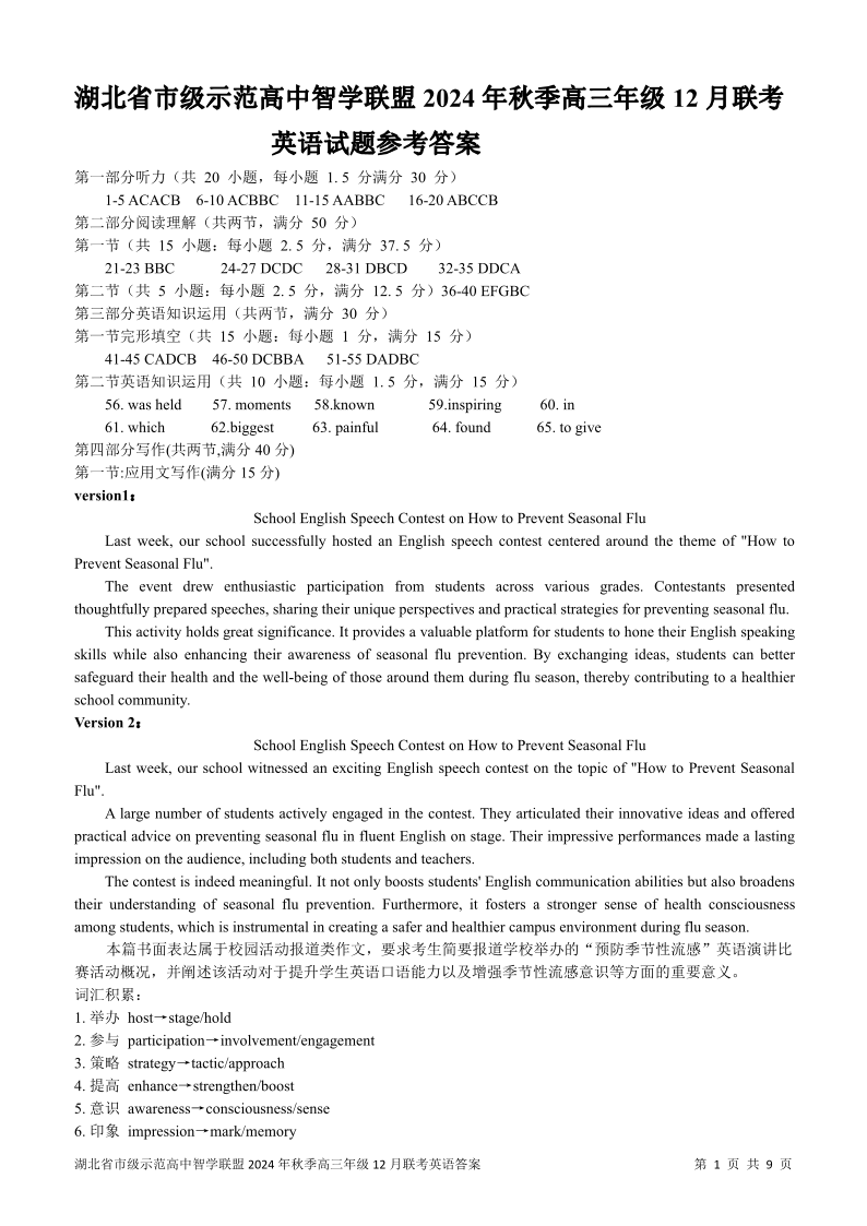 湖北省市级示范高中智学联盟 2025届高三12月联考英语答案
