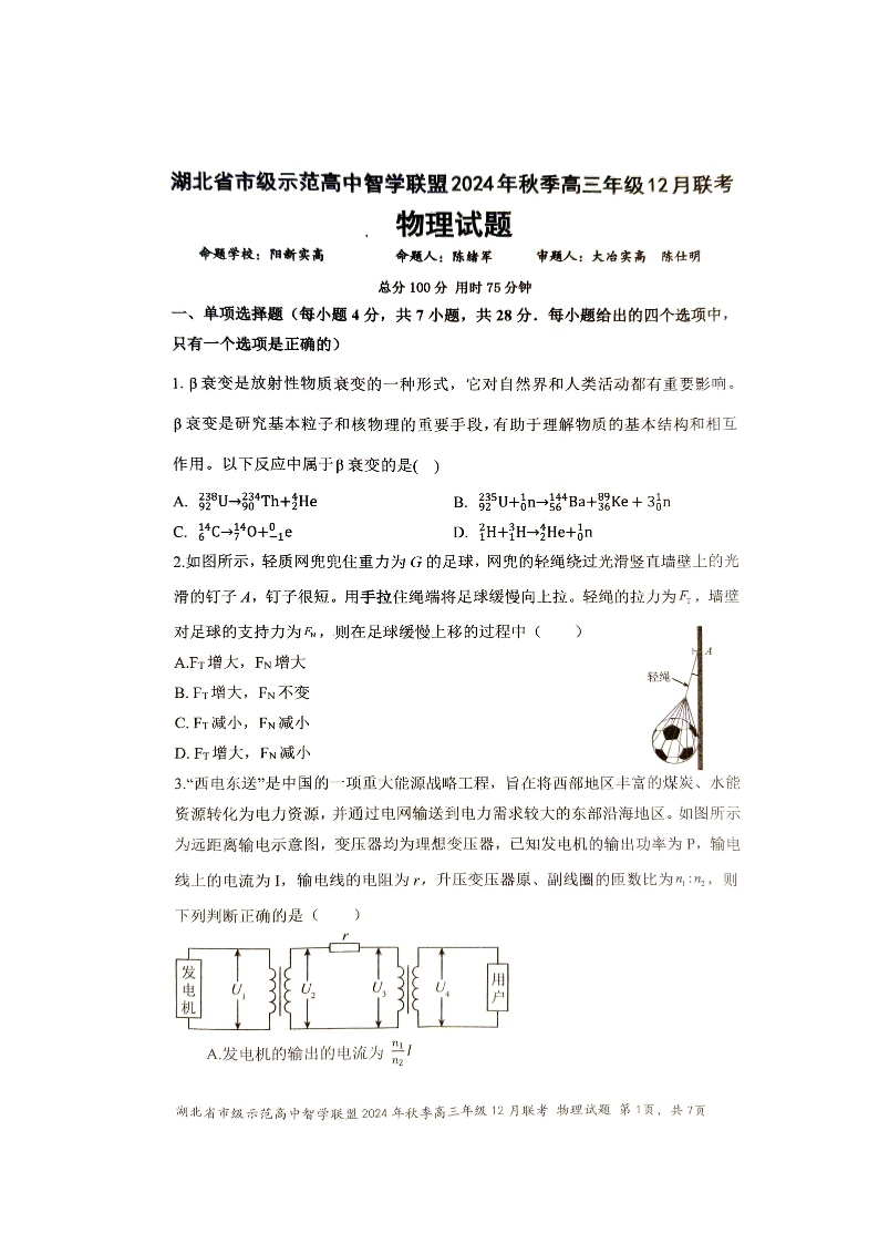 湖北省市级示范高中智学联盟 2025届高三12月联考物理