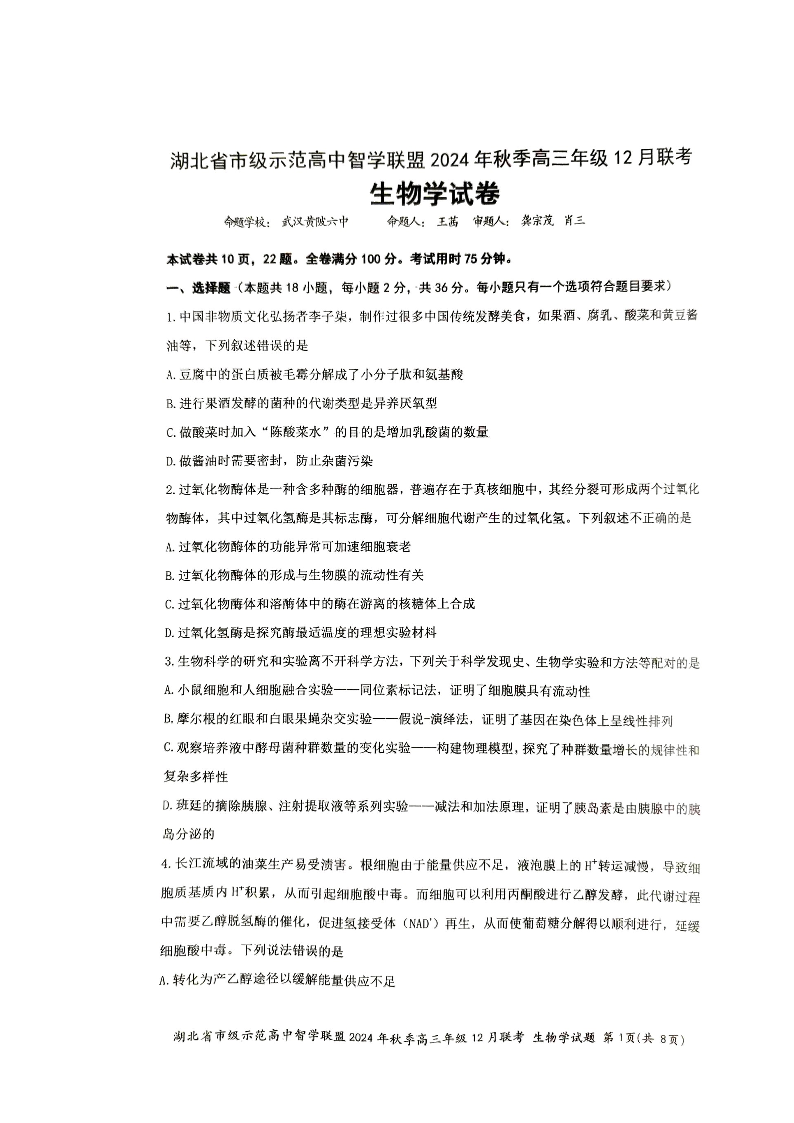 湖北省市级示范高中智学联盟 2025届高三12月联考生物