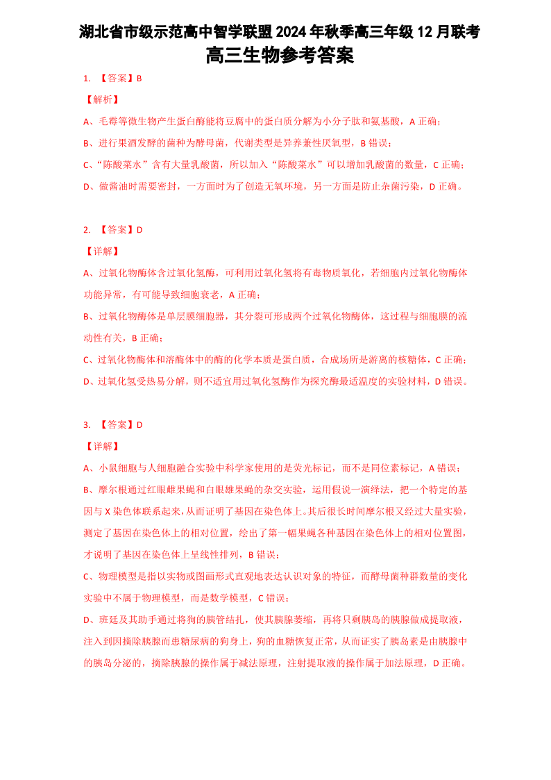 湖北省市级示范高中智学联盟 2025届高三12月联考生物答案