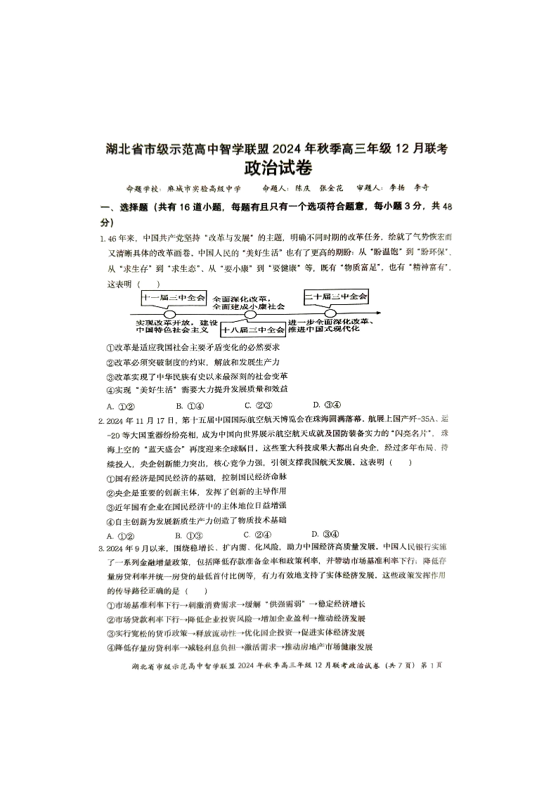 湖北省市级示范高中智学联盟 2025届高三12月联考政治
