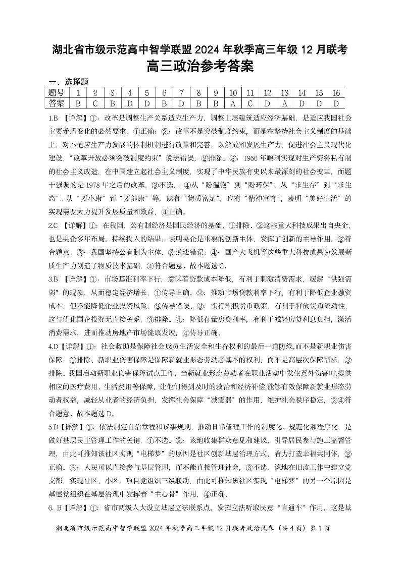 湖北省市级示范高中智学联盟 2025届高三12月联考政治答案
