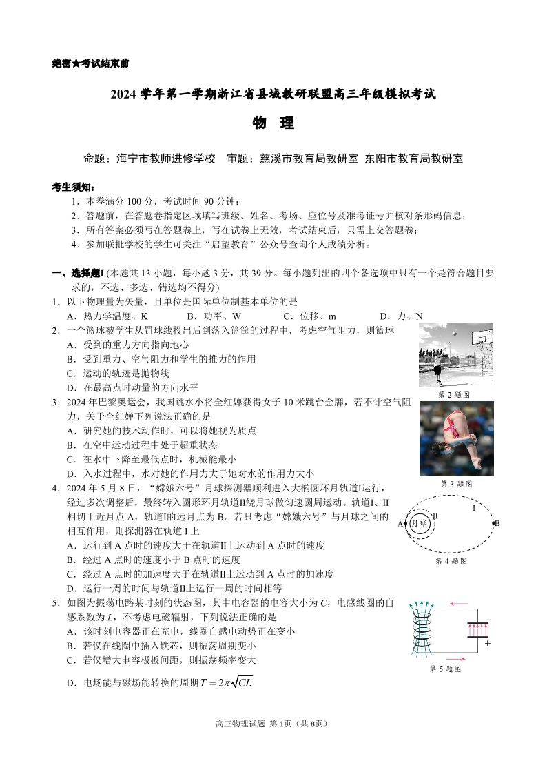 浙江省县域教研联盟2025届高三上学期12月学考模拟考物理