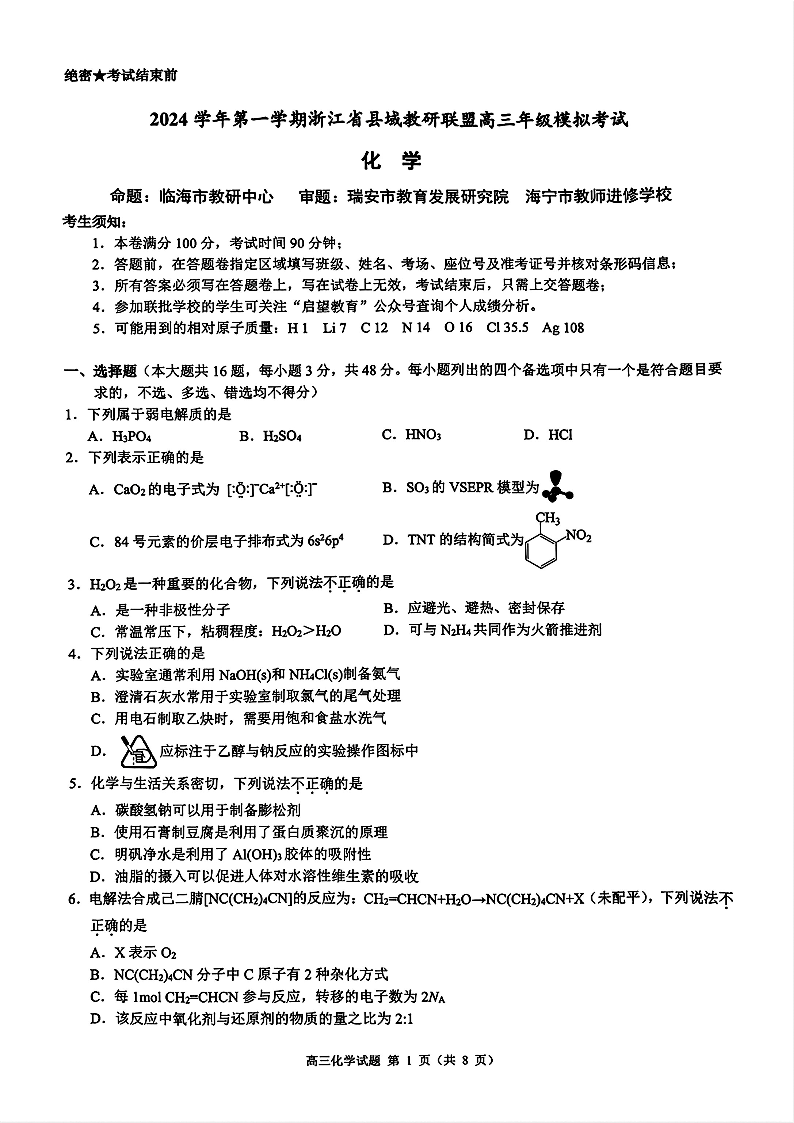 浙江省县域教研联盟2025届高三上学期12月学考模拟考化学