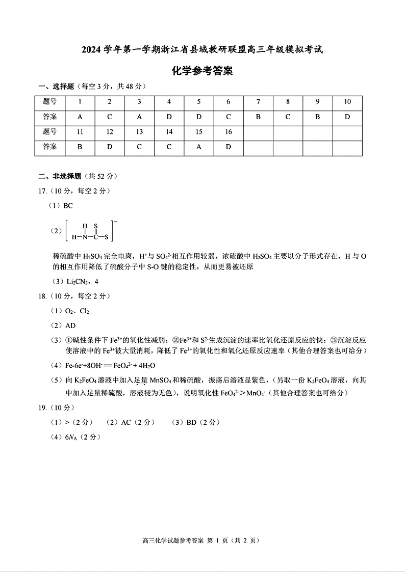 浙江省县域教研联盟2025届高三上学期12月学考模拟考化学答案