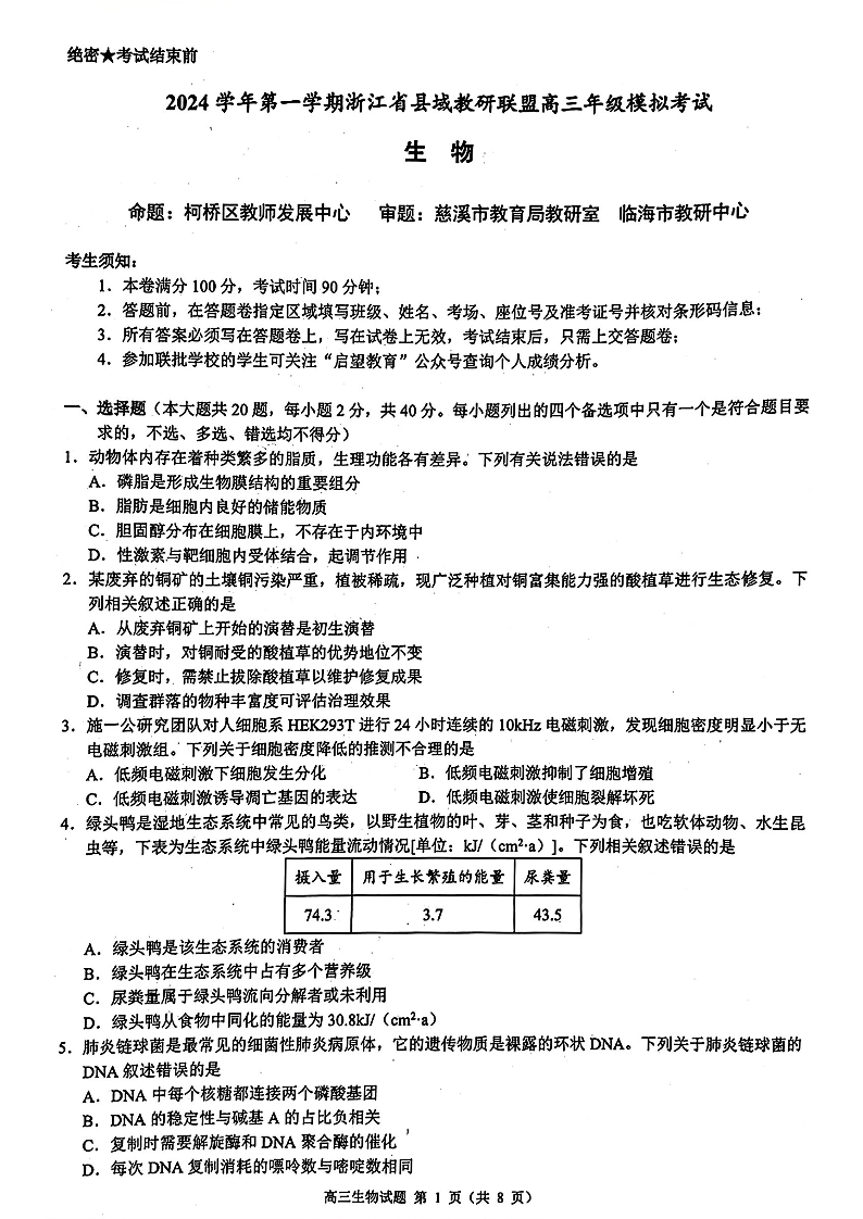 浙江省县域教研联盟2025届高三上学期12月学考模拟考生物