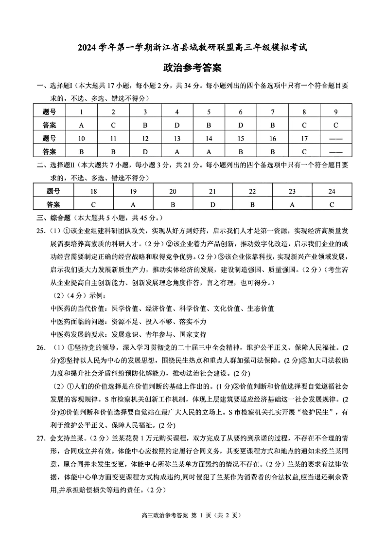 浙江省县域教研联盟2025届高三上学期12月学考模拟考政治答案
