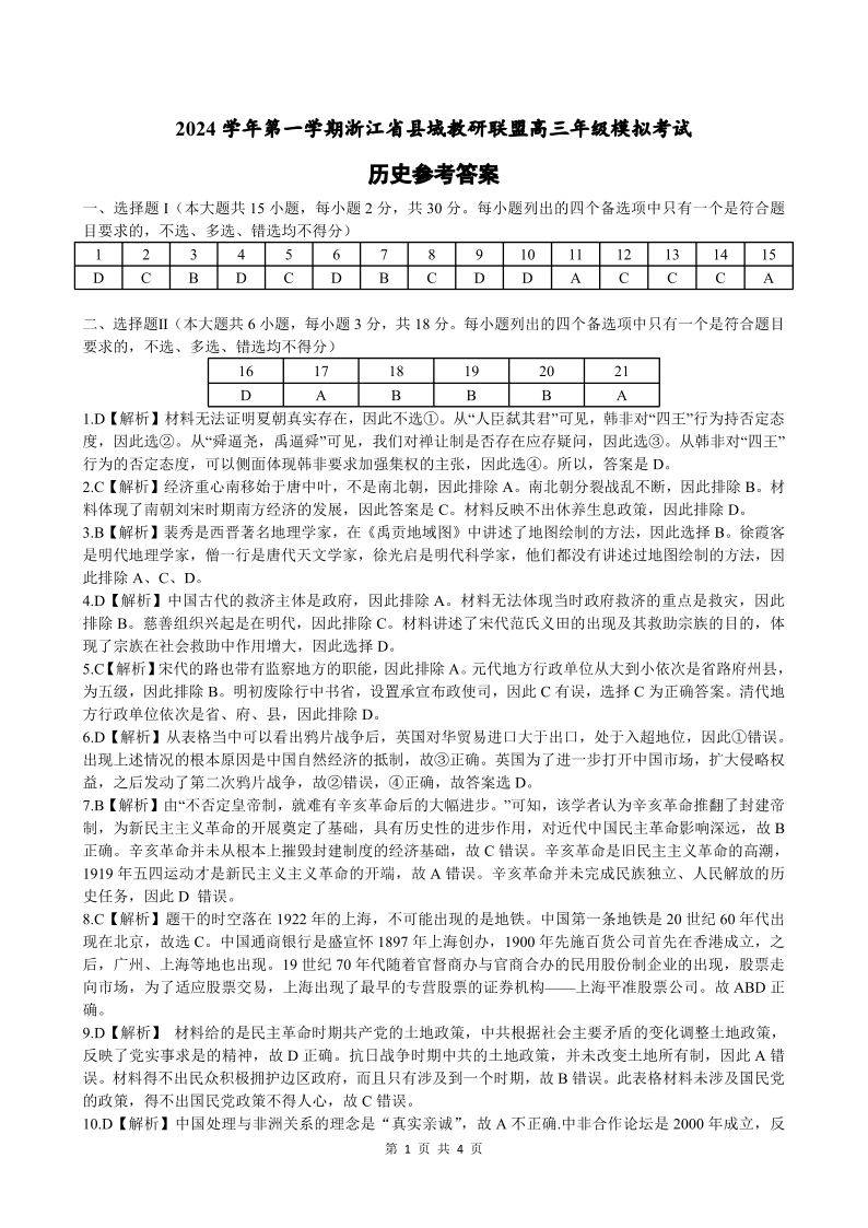 浙江省县域教研联盟2025届高三上学期12月学考模拟考历史答案