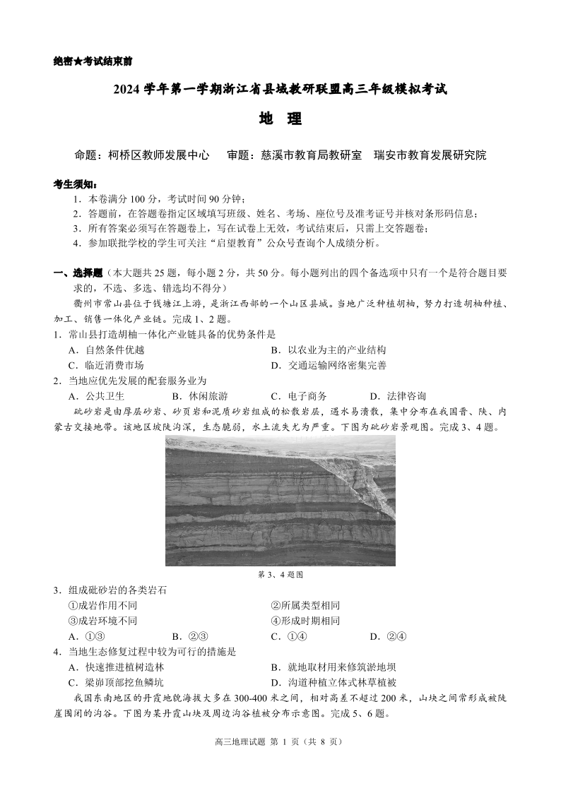 浙江省县域教研联盟2025届高三上学期12月学考模拟考地理