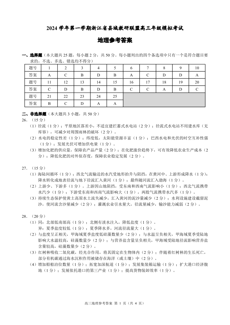 浙江省县域教研联盟2025届高三上学期12月学考模拟考地理答案