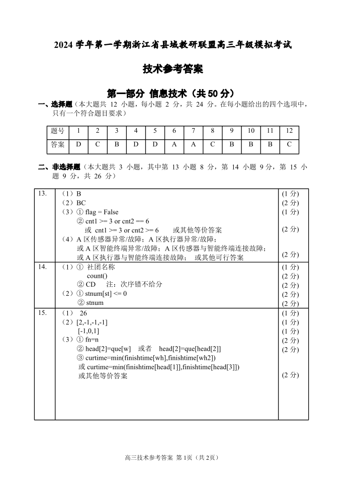 浙江省县域教研联盟2025届高三上学期12月学考模拟考技术答案