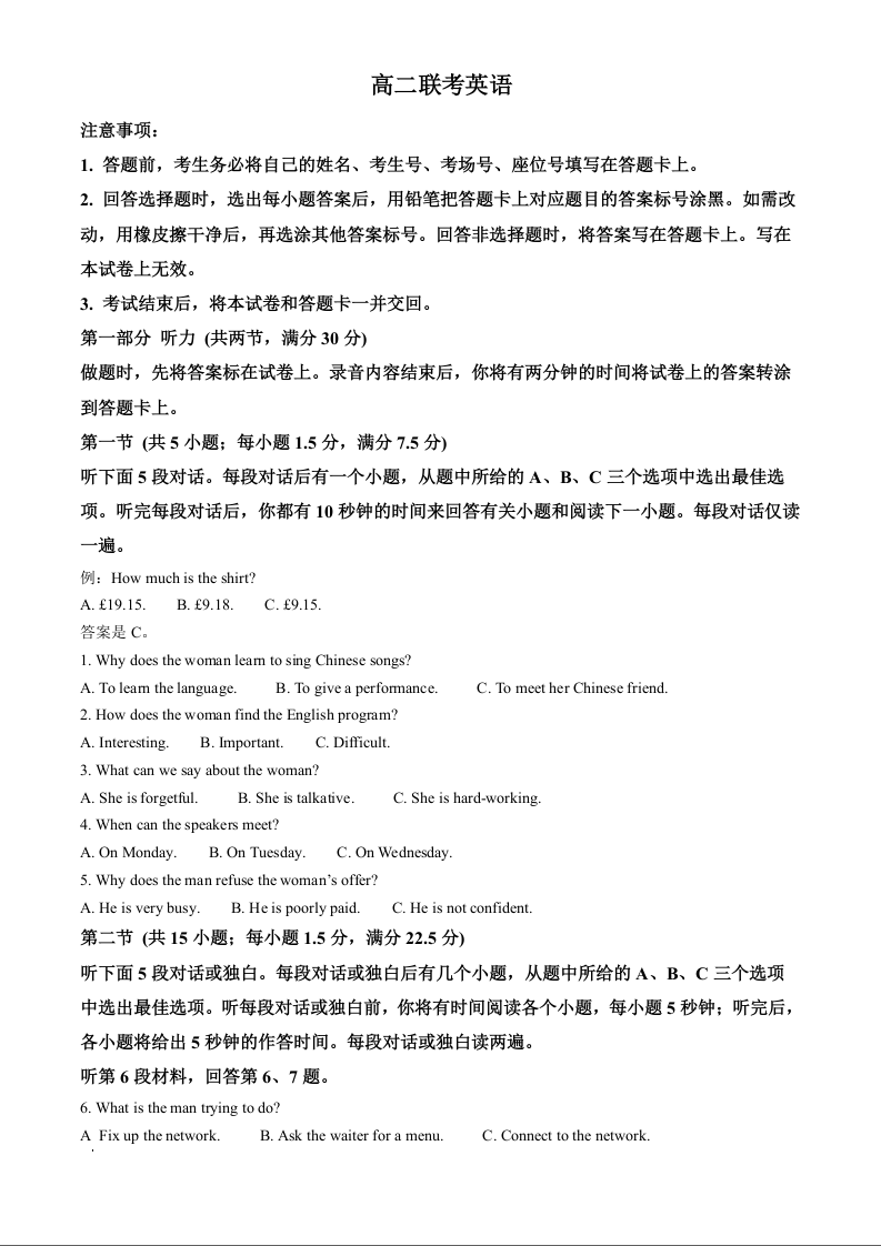 贵州省黔东南苗族侗族自治州2024-2025学年上学期高二年级期中联考英语(原卷版)
