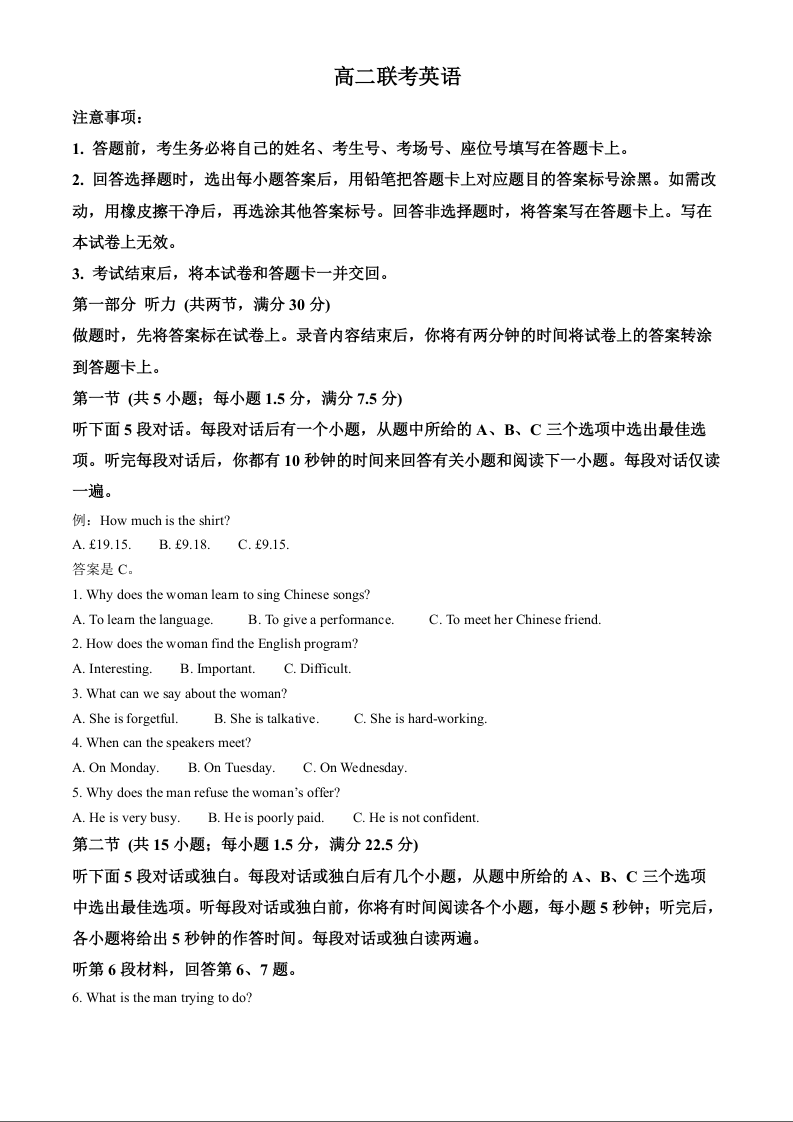 贵州省黔东南苗族侗族自治州2024-2025学年上学期高二年级期中联考英语(精品解析版)