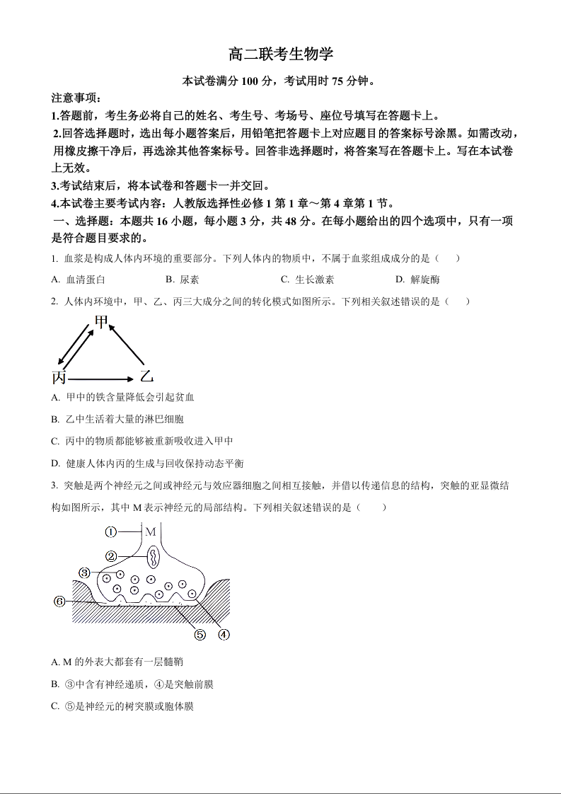 贵州省黔东南苗族侗族自治州2024-2025学年上学期高二年级期中联考生物(原卷版)