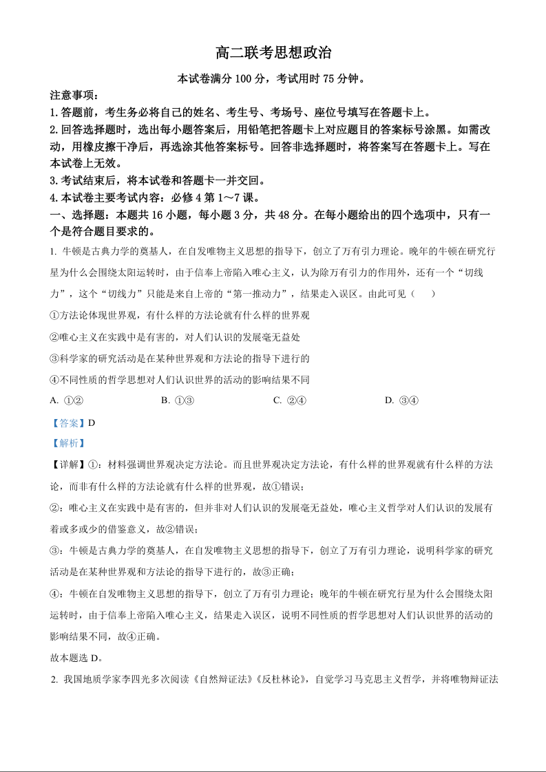 贵州省黔东南苗族侗族自治州2024-2025学年上学期高二年级期中联考政治(精品解析版)