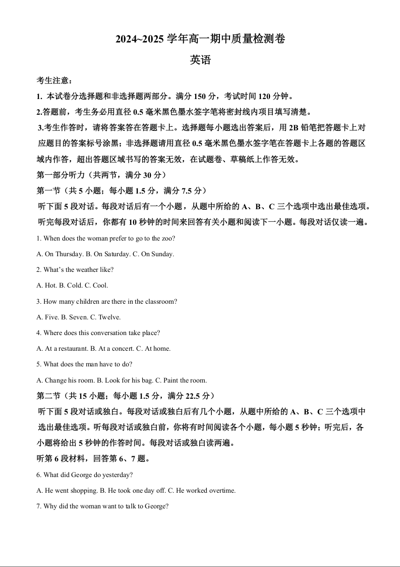 山西省部分学校2024-2025学年11月高一年级期中质量检测英语(精品解析版)