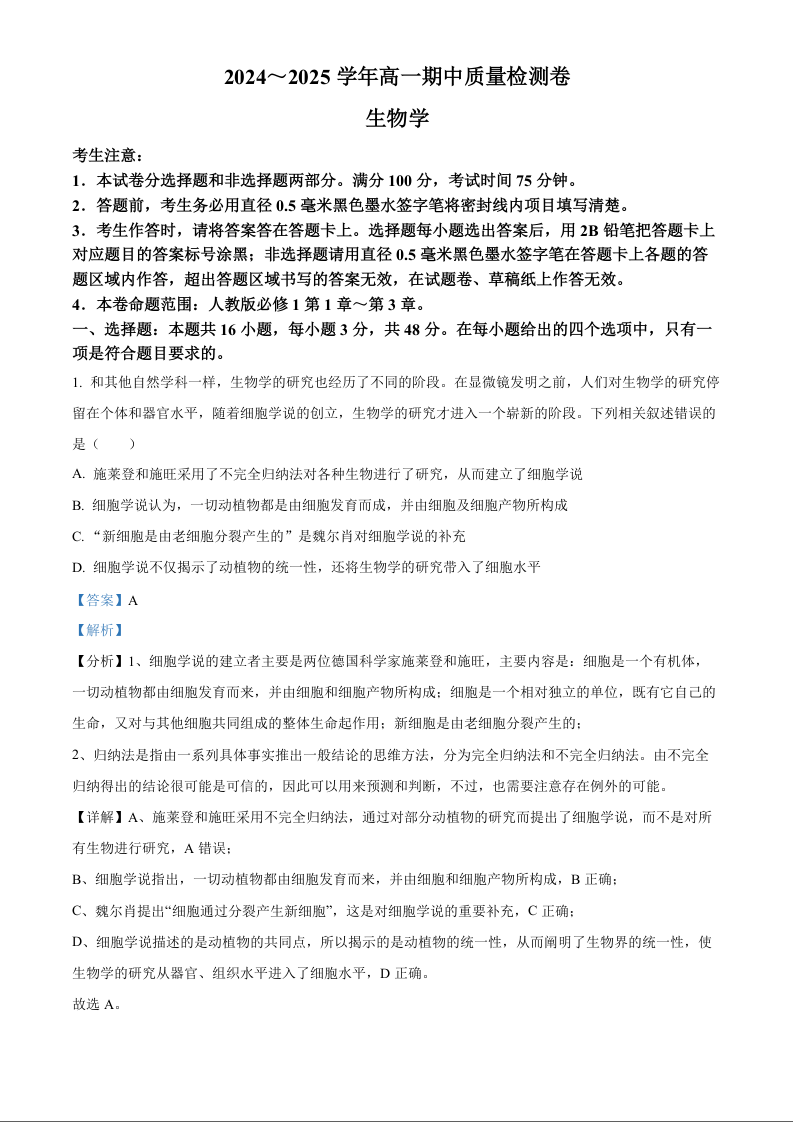 山西省部分学校2024-2025学年11月高一年级期中质量检测生物(精品解析版)