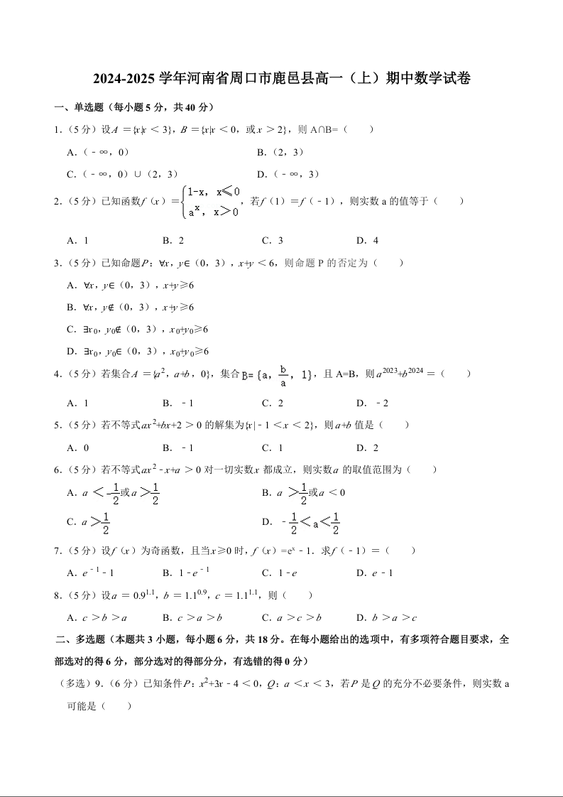 河南省周口市区域2024-2025学年高一上学期11月期中考试数学 Word版含解析