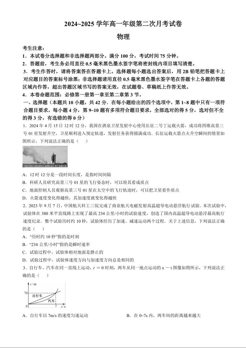安徽省亳州市区域2024-2025学年高一年级第二次月考(期中)物理 Word版含解析