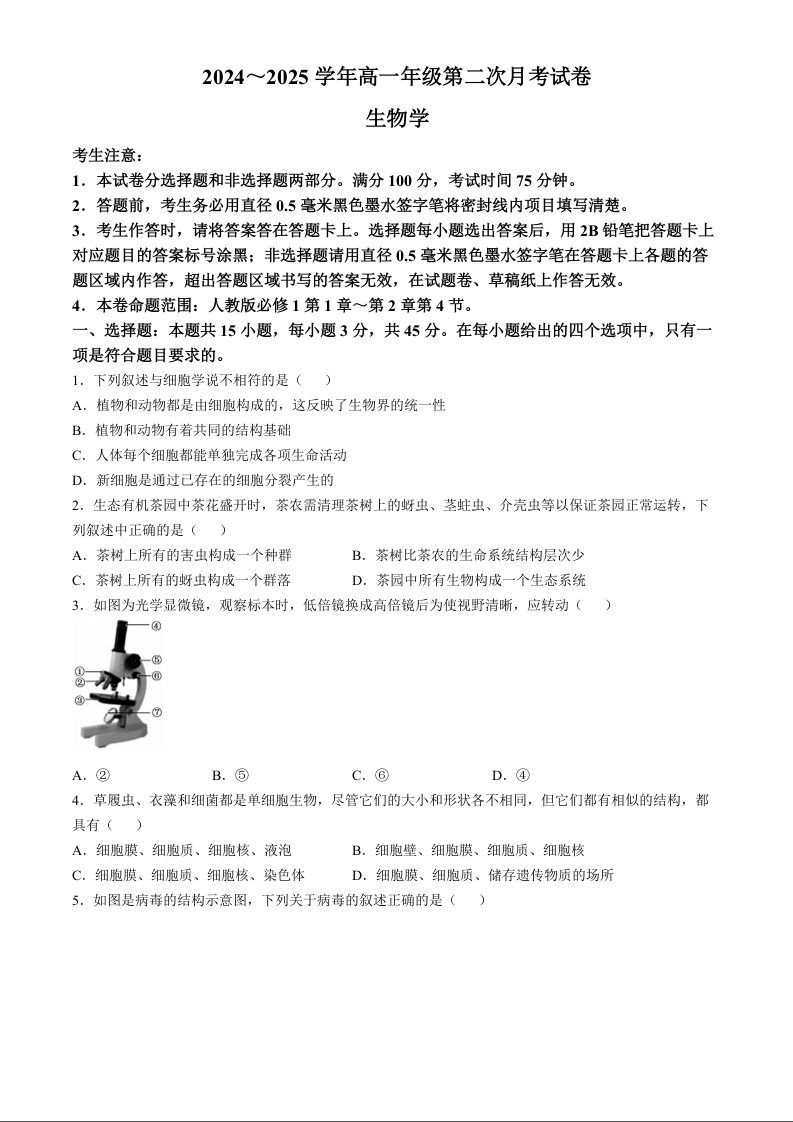 安徽省亳州市区域2024-2025学年高一年级第二次月考(期中)生物学Word版含解析