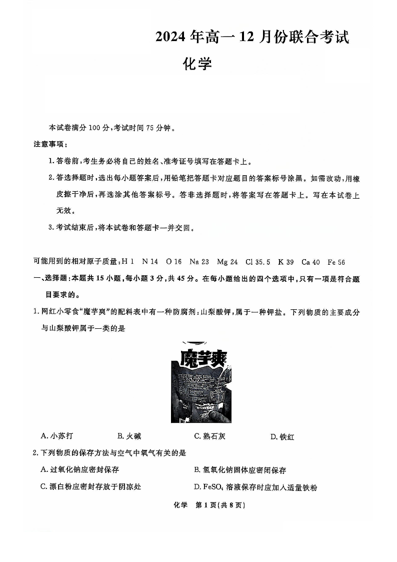 辽宁省名校联盟普通高中2024-2025学年高一12月月考化学